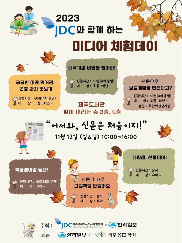 [ÇѶóÀϺ¸] ½Å¹®À» Ȱ¿ëÇÑ ´Ù¾çÇÑ ±³À°¡¤Ã¼ÇèȰµ¿À¸·Î ¼¼»ó°ú ¼ÒÅëÇÏ´Â ÀÚ¸®°¡ ¸¶·ÃµÈ´Ù. ÀÌ´Þ 12ÀÏ Á¦ÁÖµµ¼°ü°ú º°ÀÌ ³»¸®´Â ½£(3¡¤4Ãþ)¿¡¼ ¿¸®´Â '2023 JDC¿Í ÇÔ²²ÇÏ´Â ¹Ìµð¾î üÇèµ¥ÀÌ'´Ù.
