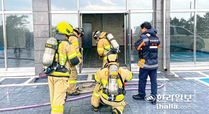Á¦ÁÖ¼ºÎ¼Ò¹æ¼(¼Àå °íÁ¤¹è)´Â 27ÀÏ Á¦Áֽà ¾Ö¿ùÀ¾ ±¤·É¸® ¼ÒÀç ¼Ò¹æ½Ã¼³ ¿Ï°øÇöÀå º¹ÇÕ°ÇÃ๰¿¡¼ ÁöÇÏÃþ ÈÀç´ëÀÀ ÈÆ·ÃÀ» ½Ç½ÃÇß´Ù.
