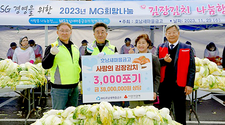 MGÈ£³²»õ¸¶À»±Ý°í(ÀÌ»çÀå ±è¿ë¼®)´Â Áö³´Þ 29ÀÏ È£³²»õ¸¶À»±Ý°í ÁÖÂ÷Àå¿¡¼ ESG°æ¿µÀ» À§ÇÑ '2023³â MGÈñ¸Á³ª´® ±èÀå±èÄ¡ ³ª´®Çà»ç'¸¦ ÁøÇàÇϰí Á÷Á¢ ´ã±Ù ±èÀå±èÄ¡ 3000Æ÷±â(3800¸¸¿ø »ó´ç)¸¦ Á¦ÁÖ»çȸº¹Áö°øµ¿¸ð±Ýȸ(ȸÀå °Áö¾ð)¿¡ ±âŹÇß´Ù.