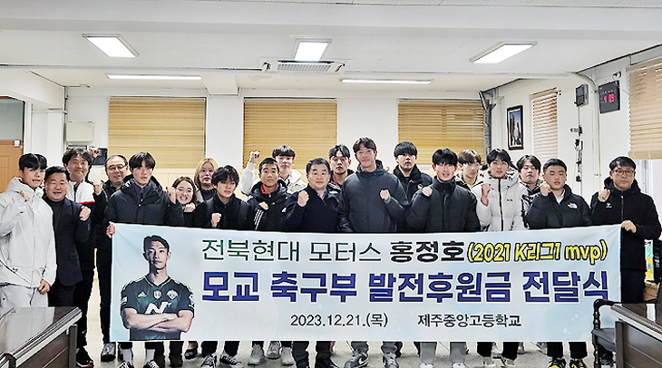 Á¦ÁÖÁß¾Ó°íµîÇб³(±³Àå ¾È°æÈ£)¸¦ Á¹¾÷Çϰí ÇöÀç K¸®±×1 ÀüºÏÇö´ë¸ðÅͽºFC¿¡¼ Ȱ¾àÇϰí ÀÖ´Â È«Á¤È£ ¼±¼ö°¡ Áö³ 21ÀÏ ¸ð±³ Ã౸ºÎ ÈĹèµéÀ» À§ÇØ Ã౸ºÎ ¹ßÀü±â±Ý 500¸¸¿øÀ» Àü´ÞÇß´Ù.