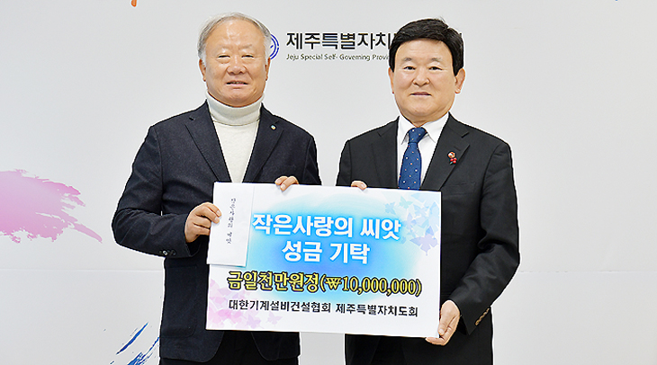 ´ëÇѱâ°è¼³ºñ°Ç¼³Çùȸ Á¦ÁÖÆ¯º°ÀÚÄ¡µµÈ¸ Çöµ¿¼ö ȸÀåÀº Áö³ 21ÀÏ Á¦ÁÖÆ¯º°ÀÚÄ¡µµ±³À°Ã»À» ¹æ¹®ÇØ ±è±¤¼ö ±³À°°¨¿¡°Ô 'ÀÛÀº »ç¶ûÀÇ ¾¾¾Ñ' ¼º±Ý 1000¸¸¿øÀ» ±âŹÇß´Ù.
