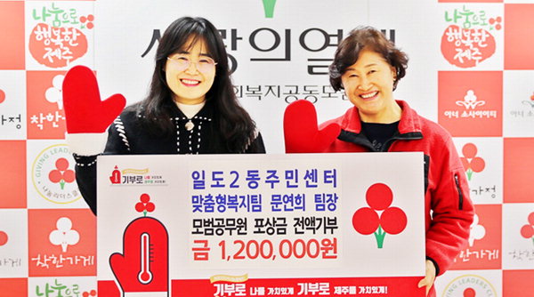 Á¦Áֽà Àϵµ2µ¿Áֹμ¾ÅÍ ¹®¿¬Èñ ÆÀÀåÀº Áö³ 19ÀÏ Á¦ÁÖ»çȸº¹Áö°øµ¿¸ð±Ýȸ(ȸÀå °Áö¾ð)¸¦ ¹æ¹®ÇØ ¸ð¹ü°ø¹«¿ø Æ÷»ó±Ý 120¸¸¿øÀ» ±âºÎÇß´Ù.