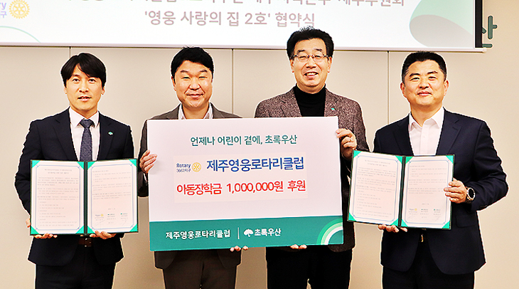 ±¹Á¦·ÎŸ¸®3662Áö±¸ Á¦ÁÖ¿µ¿õ·ÎŸ¸®Å¬·´(ȸÀå ¾çµ¿¼ö)°ú ÃÊ·Ï¿ì»ê Á¦ÁÖÁö¿ªº»ºÎ(º»ºÎÀå º¯Á¤±Ù), ÃÊ·Ï¿ì»ê Á¦ÁÖÈÄ¿øÈ¸(ȸÀå Ȳ±Ý½Å)´Â Áö³ 24ÀÏ ¿µ¿õ »ç¶ûÀÇ Áý 2È£ ¾÷¹«Çù¾à½ÄÀ» ÁøÇàÇÏ°í ¾Æµ¿ ÀåÇÐ±Ý 100¸¸¿øÀ» Àü´ÞÇß´Ù.