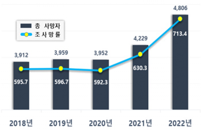 ÃÖ±Ù 5³â°£ »ç¸ÁÀÚ ¼ö´Â 2¸¸858¸íÀ¸·Î ¿¬Æò±Õ »ç¸ÁÀÚ´Â 4171.6¸í, ÀÏÆò±Õ 11.4¸í, ÀÏÆò±Õ Á¶»ç¸Á·üÀº 1.7¸íÀÌ´Ù.