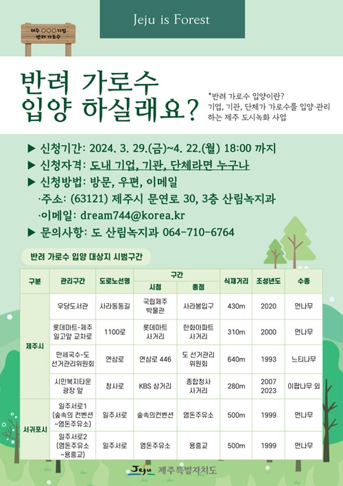 ÀÔ¾ç ´ë»óÀº 6°³(Á¦Áֽà 4, ¼±ÍÆ÷½Ã 2) ±¸°£ 2660m ±¸°£¿¡ ½ÄÀçµÈ °¡·Î¼ö¿Í ³ìÁö´ë´Ù. ±â¾÷, ±â°ü, ´Üü°¡ °¡·Î¼ö¸¦ ÀÔ¾çÇØ ½Ç¸íÀ¸·Î °ü¸®ÇÑ´Ù.
