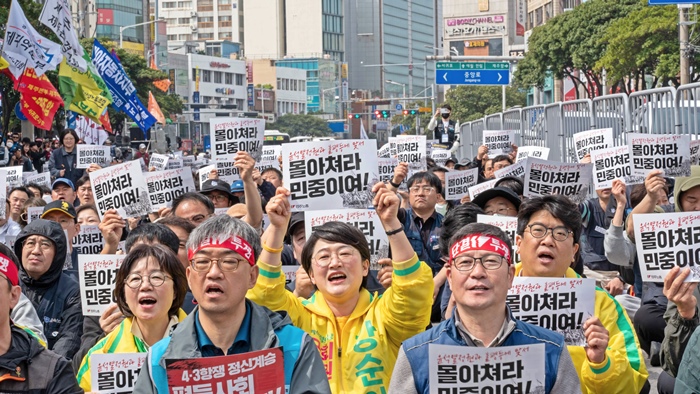 ±èÁØ¿ì »óÀÓ´ëÇ¥´Â "77³â Àü Á¦ÁÖ¿¡¼ ¿ï·Á ÆÛÁø Ç×Àï°ú Àü ¼¼°è À¯·Ê¾ø´Â 3¡¤10 ¹Î°üÃÑÆÄ¾÷À» °è½ÂÇϰí, µ¶¼±°ú ¹«´ÉÀÇ À±¼®¿ Á¤±ÇÀ» ½ÉÆÇÇØ¾ß ÇÑ´Ù´Â ¸ñ¼Ò¸®¿¡ ÇÔ²² Çϱâ À§ÇØ Á¦ÁÖ¿¡ ¿Ô´Ù"¸é¼ "³ì»öÁ¤ÀÇ´çÀÌ Á¦ÁÖ¹ÎÁßÀÇ Ç×ÀïÁ¤½ÅÀ» À̾î¹Þ¾Æ Á¤ÀÇ·Ó°Ô À±¼®¿ Á¤±Ç ½ÉÆÇÀ» ÇØ³ª°¡°Ú´Ù"°í ¹àÇû´Ù.