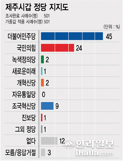 ¢ºÁ¤´ç ÁöÁöµµ=Á¦Áֽð© ¼±°Å±¸ Á¤´ç ÁöÁöµµ¿¡¼´Â ´õºÒ¾î¹ÎÁÖ´çÀÌ 45%ÀÇ ÁöÁö¸¦ ¹ÞÀ¸¸ç ±¹¹ÎÀÇÈû 24%º¸´Ù ¾Õ¼± °ÍÀ¸·Î Á¶»çµÆ´Ù. À̾î Á¶±¹Çõ½Å´ç 9%, ³ì»öÁ¤ÀÇ´ç 2%, °³Çõ½Å´ç 2%, »õ·Î¿î¹Ì·¡¡¤Áøº¸´ç¡¤±× ¿Ü Á¤´ç °¢ 1% ¼øÀ̾ú´Ù. '¾ø´Ù', '¸ð¸§¡¤ÀÀ´ä °ÅÀý'Àº °¢°¢ 12%, 3% ¿´´Ù.