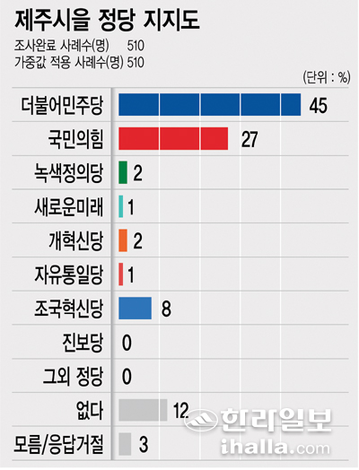 ¢º±¹È¸ÀÇ¿ø Èĺ¸ ÁöÁöµµ=Á¦ÁÖ½ÃÀ» ¼±°Å±¸¿¡ Ã⸶ÇÑ Èĺ¸ Áß ´©°¡ ±¹È¸ÀÇ¿øÀÌ µÇ´Â °ÍÀÌ °¡Àå ÁÁ´Ù°í »ý°¢ÇÏ´ÂÁö 'Èĺ¸ ÁöÁöµµ'¸¦ ¹¯´Â Áú¹®¿¡ 62%°¡ ´õºÒ¾î¹ÎÁÖ´ç ±èÇÑ±Ô È帶ó°í ´äÇß´Ù. ±¹¹ÎÀÇÈû ±è½Â¿í Èĺ¸ 24%, ³ì»öÁ¤ÀÇ´ç °¼ø¾Æ Èĺ¸ 1%ÀÇ ¼øÀ̾úÀ¸¸ç '¾ø´Ù' 7%, '¸ð¸§¡¤ÀÀ´ä °ÅÀý' 6%·Î Áý°èµÆ´Ù.
