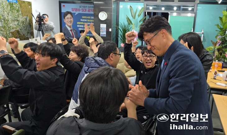 Á¦ÁÖÀÚÄ¡µµÀÇȸÀÇ¿ø Á¦Áֽà ¾Æ¶óµ¿À» º¸±È¼±°Å¿¡¼ ´ç¼±ÀÌ È®Á¤µÈ ¾ç¿µ¼ö È帰¡ 11ÀÏ ÀÚ½ÅÀÇ ¼±°Å»ç¹«¼Ò¿¡¼ ÁöÁöÀÚµéÀÇ È¯È£¿¡ È´äÇϰí ÀÖ´Ù. |