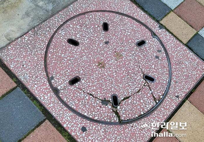 Á¦Áֽà °ÇÀÔµ¿ ÃʵîÇб³ ÁÖº¯ º¸µµ¿¡ ¼³Ä¡µÈ ÄÜÅ©¸®Æ® ÀçÁúÀÇ ¸ÇȦ ¶Ñ²±ÀÌ °¥¶óÁ® ±ÝÀÌ »ý°å´Ù. ÇѶóÀϺ¸ ÀÚ·á»çÁø.