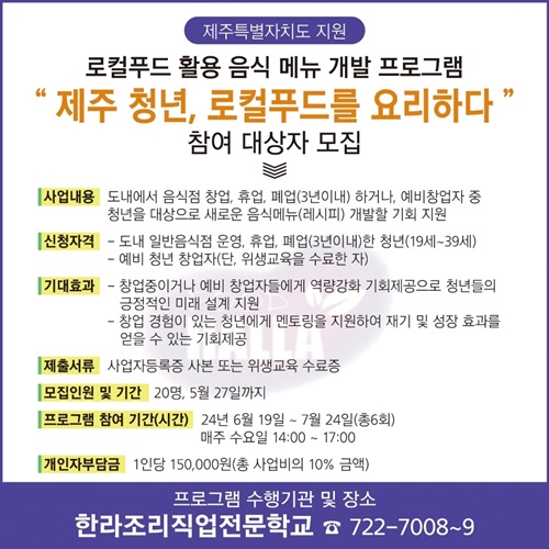[ÇѶóÀϺ¸] Á¦ÁÖÆ¯º°ÀÚÄ¡µµ°¡ Á¦ÁÖ»ê ³ó»ê¹°À» ÀÌ¿ëÇÑ À½½Ä °³¹ß ÇÁ·Î±×·¥¿¡ µµÀüÇÒ Ã»³â Âü¿©ÀÚ¸¦ ¿À´Â 27ÀϱîÁö ¸ðÁýÇÑ´Ù.