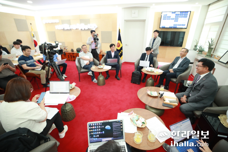 ±è°æÇÐ Á¦ÁÖµµÀÇȸ ÀÇÀåÀÌ 18ÀÏ µµÀÇȸ ÀÇÀå½Ç¿¡¼ ÀÓ±â Á¾·á¸¦ ¾ÕµÎ°í ±âÀÚȸ°ßÀ» Çϰí ÀÖ´Ù. »çÁø=µµÀÇȸ