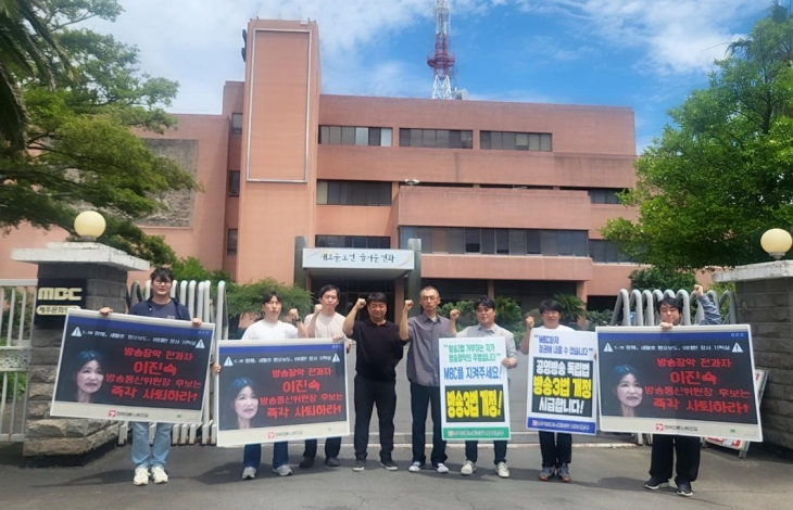 ¾ð·Ð³ëÁ¶ Á¦ÁÖÇùÀÇȸ°¡ ÃÖ±Ù Á¦ÁÖMBC ¾Õ¿¡¼ ÇÇÄÏ ½ÃÀ§¸¦ ¹úÀ̸ç ÀÌÁø¼÷ ¹æ¼ÛÅë½ÅÀ§¿øÀå Èĺ¸ÀÚ Áö¸í öȸ¸¦ Ã˱¸Çϰí ÀÖ´Ù.