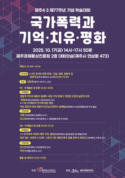 [ÇѶóÀϺ¸] Á¦ÁÖ4¡¤3¿¬±¸¼Ò´Â ¿À´Â 17ÀÏ ¿ÀÈÄ 2½Ã Á¦ÁÖ°æÁ¦Åë»óÁøÈï¿ø 2Ãþ ´ëȸÀǽǿ¡¼ '±¹°¡Æø·Â°ú ±â¾ï¡¤Ä¡À¯¡¤ÆòÈ'¸¦ ÁÖÁ¦·Î Á¦ÁÖ4¡¤3 Á¦77Áֳ⠱â³ä Çмú´ëȸ¸¦ °³ÃÖÇÑ´Ù.