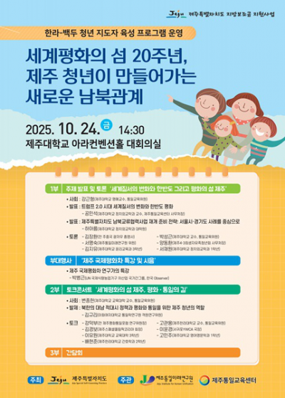 [ÇѶóÀϺ¸] ¼¼°èÆòÈÀÇ ¼¶ ÁöÁ¤ 20ÁÖ³âÀ» ¸Â¾Æ û³â ¼¼´ë°¡ ÁÖµµÇÏ´Â ÅëÀÏ ³íÀÇÀÇ ÀåÀÌ ¸¶·ÃµÈ´Ù. Á¦ÁÖÆ¯º°ÀÚÄ¡µµ°¡ ÁÖÃÖÇϰí Á¦ÁÖÅëÀϹ̷¡¿¬±¸¿ø°ú Á¦ÁÖÅëÀϱ³À°¼¾ÅͰ¡ ÁÖ°üÇÏ´Â '2025³â ÇѶó-¹éµÎ û³âÁöµµÀÚ À°¼º ÇÁ·Î±×·¥'ÀÌ´Ù.