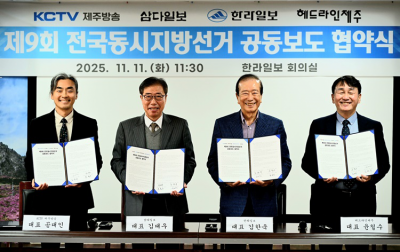 ÇѶóÀϺ¸¿Í »ï´ÙÀϺ¸, KCTVÁ¦ÁÖ¹æ¼Û, Çìµå¶óÀÎÁ¦ÁÖ µî Á¦ÁÖÁö¿ª ´ëÇ¥ ¾ð·Ð 4»ç´Â ³»³â 6¿ù Ä¡·¯Áú Áö¹æ¼±°Å¸¦ ¾ÕµÎ°í 11ÀÏ ÇѶóÀϺ¸ 3Ãþ ´ëȸÀǽǿ¡¼ 'Á¦9ȸ Àü±¹µ¿½ÃÁö¹æ¼±°Å °øµ¿º¸µµ Çù¾à½Ä'À» °³ÃÖÇß´Ù. ¿ÞÂʺÎÅÍ °ø´ëÀÎ KCTVÁ¦ÁÖ¹æ¼Û ´ëÇ¥, ±è´ë¿ì »ï´ÙÀϺ¸ ´ëÇ¥, ±èÇÑ¿í ÇѶóÀϺ¸ ´ëÇ¥, À±Ã¶¼ö Çìµå¶óÀÎÁ¦ÁÖ ´ëÇ¥. °Èñ¸¸±âÀÚ