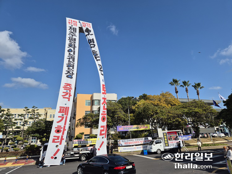 Á¦ÁÖÆòÈÀαÇÇåÀå ¼±Æ÷°¡ ÀÓ¹ÚÇÏÀÚ ¹Ý´ë´ÜüµéÀº ÃÖ±Ù µµÃ» ¾Õ¿¡¼ ´ë±Ô¸ð Áýȸ¸¦ ¿©´Â µî ´õ¿í °ÝÇÏ°Ô ¹Ý¹ßÇϰí ÀÖ´Ù.
