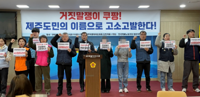 °í(ͺ) ¿À½Â¿ë ¾¾ÀÇ À¯°¡Á·°ú Àü±¹Åùè³ëµ¿Á¶ÇÕ Á¦ÁÖÁöºÎ´Â 5ÀÏ ¿ÀÀü Á¦ÁÖµµÀÇȸ µµ¹ÎÄ«Æä¿¡¼ ±âÀÚȸ°ßÀ» ¿°í ¡°°ÅÁþ¸»ÀïÀÌ ÄíÆÎÀ» Á¦ÁÖµµ¹ÎÀÇ À̸§À¸·Î °í¼Ò¡¤°í¹ßÇÑ´Ù¡±°í ¹àÇû´Ù.