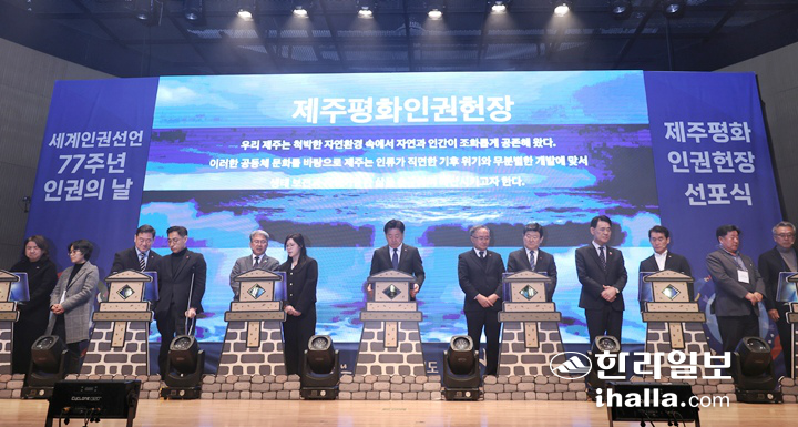 [ÇѶóÀϺ¸] Á¦ÁÖ4¡¤3ÀÇ ¹ÎÁÖÁÖÀÇ¿Í ÆòÈ, ÀαÇÀÇ °¡Ä¡¸¦ ¹ÙÅÁÀ¸·Î 'ÆòÈ¿Í ÀαÇÀÇ ¼¶ Á¦ÁÖ'¸¦ ½ÇÇöÇϰíÀÚ Á¦Á¤µÈ Á¦ÁÖÆòÈÀαÇÇåÀåÀÌ 10ÀÏ °ø½Ä ¼±Æ÷µÆ´Ù.