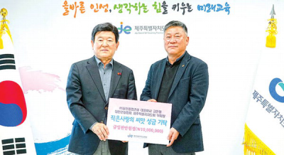 [ÇѶóÀϺ¸] (ÁÖ)µ¿ÀÎÁ¾ÇհǼ³(´ëÇ¥ °í¸¸Ã¶)°ú (ÁÖ)¼¼Çö°Ç¼³(´ëÇ¥ ±èÇü±¸)Àº 18ÀÏ Á¦ÁÖÆ¯º°ÀÚÄ¡µµ±³À°Ã»¿¡ 'ÀÛÀº »ç¶ûÀÇ ¾¾¾Ñ' ¼º±Ý 2000¸¸¿øÀ» ±âŹÇß´Ù.