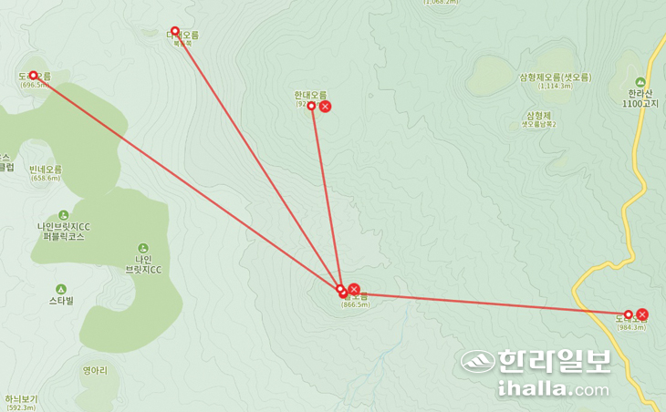 °ËÀºµé¸Ô¿À¸§¿¡¼ ³²¼ÂÊ, µ¹¿À¸§¿¡¼´Â ºÏ¼ÂÊÀ¸·Î 4§° ¶³¾îÁø °÷¿¡ µµ·¡¿À¸§(´Ú·¡¿À¸§)ÀÌ ÀÖ´Ù. Ç¥°í 696.5m, ÀÚü³ôÀÌ 87m´Ù. Á¦ÁÖµµ°¡ ¹ßÇàÇÑ Á¦ÁÖÀÇ ¿À¸§À̶ó´Â Ã¥¿¡´Â ´Ù·¡¿À¸§(´Ú·¡¿À¸§), ³×À̹öÁöµµ¿Í īī¿À¸Ê¿¡´Â µµ·¡¿À¸§À¸·Î Ç¥±âÇß´Ù.