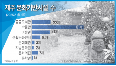 4ÀÏ ¹®ÈüÀ°°ü±¤ºÎÀÇ '2025 Àü±¹¹®È±â¹Ý½Ã¼³ ÃѶ÷'¿¡ µû¸£¸é Áö³ÇØ 1¿ù ±âÁØ Á¦ÁÖ ¹®È±â¹Ý½Ã¼³Àº 127°³·Î Àü±¹ Àüü(3337°³)ÀÇ 3.8%¸¦ Â÷ÁöÇÑ´Ù. ½Ã¼³º°·Î´Â °ø°øµµ¼°ü 22°³, ¹Ú¹°°ü 61°³, ¹Ì¼ú°ü 21°³, »ýȰ¹®È¼¾ÅÍ 10°³, ¹®¿¹È¸°ü 3°³, Áö¹æ¹®È¿ø 2°³, ¹®ÈÀÇÁý 7°³, ¹®Çаü 1°³ µîÀÌ´Ù.