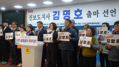 [ÇѶóÀϺ¸] ±è¸íÈ£ Áøº¸´ç Á¦ÁÖµµ´ç À§¿øÀåÀÌ ¿À´Â 6¿ù Á¦9ȸ Àü±¹µ¿½ÃÁö¹æ¼±°Å Á¦ÁÖµµÁö»ç Ã⸶¸¦ ¼±¾ðÇß´Ù. ±è¸íÈ£ À§¿øÀåÀº 7ÀÏ ¿ÀÀü Á¦ÁÖµµÀÇȸ µµ¹ÎÄ«Æä¿¡¼ ¿¸° Ã⸶ ¼±¾ð ±âÀÚȸ°ß¿¡¼ "µµ¹ÎÀÇ »ì¸²»ìÀ̸¦ µÇ»ì¸®´Â Áøº¸ µµÁö»ç, ³ëµ¿ÀÚ µµÁö»ç°¡ µÇ°Ú´Ù"°í ¹àÇû´Ù.