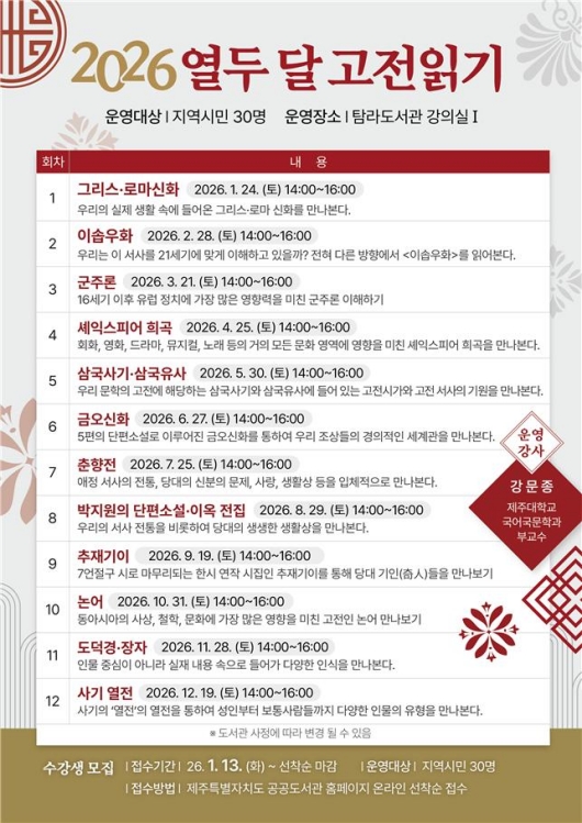 ¿µÎ ´Þ °íÀü Àбâ´Â °íÀü¿¡ ´ã±ä »ç»óÀ» ÀÌÇØÇÏ°í »îÀÇ ÁöÇý¸¦ ¾ò´Â ½Ã°£À¸·Î ²Ù·ÁÁø´Ù. ¸Å´Þ ÇÑ ÆíÀÇ °íÀüÀ» ÇÔ²² ÀÐ°í °¿¬À» ÅëÇØ ´Ù¾çÇÑ ÇØ¼®À» °øÀ¯ÇÑ´Ù. ¿ÃÇØ´Â ±×¸®½º ·Î¸¶½ÅÈ, ±ºÁÖ·Ð, »ï±¹»ç±â, ±Ý¿À½ÅÈ µî 12ÆíÀÇ µ¿¼¾ç °íÀüÀ» ¸¶ÁÖÇÑ´Ù.