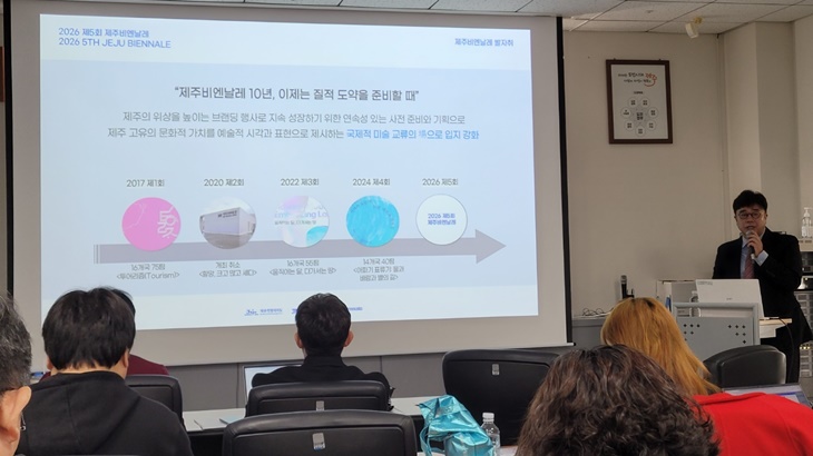 12ÀÏ ¿ÀÀü Á¦ÁÖµµ¸³¹Ì¼ú°ü ȸÀǽǿ¡¼ ¿¸° ±âÀÚ°£´ãȸ¿¡¼ ÀÌÁ¾ÈÄ Á¦ÁÖµµ¸³¹Ì¼ú°üÀåÀÌ '2026 Á¦5ȸ Á¦ÁÖºñ¿£³¯·¹'ÀÇ ¿î¿µ¹æÇâ°ú Àü½Ã ÁÖÁ¦¸¦ ¼³¸íÇϰí ÀÖ´Ù. ¹Ú¼ÒÁ¤±âÀÚ