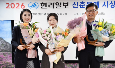 [ÇѶóÀϺ¸] 2026 ÇѶóÀϺ¸ ½ÅÃá¹®¿¹ ½Ã»ó½ÄÀÌ 19ÀÏ ÇѶóÀϺ¸ 3Ãþ ȸÀǽǿ¡¼ ¿·È´Ù. »õÇØ ÇѶóÀϺ¸ ½ÅÃá¹®¿¹¸¦ ÅëÇØ ÀÛ°¡·Î ù¹ßÀ» µðµò 3¸íÀÇ ´ç¼±ÀÚ´Â Àú¸¶´ÙÀÇ ¹æ½ÄÀ¸·Î ±ÛÀ» ¾²¸ç ¼¼»ó°ú ¼ÒÅëÇϰڴٴ Æ÷ºÎ¸¦ ÀüÇß´Ù.