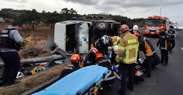 20ÀÏ Æòȷο¡¼ Á¦Áֽà ¹æ¸éÀ¸·Î ´Þ¸®´ø 2.5t ȹ°Â÷°¡ ¿¬¼® µîÀ» µéÀ̹ްí Àüµµ, ÀÌ »ç°í·Î ¿îÀüÀÚ µî 2¸íÀÌ Áß°æ»óÀ» ÀÔ¾î ¼Ò¹æ´ç±¹ÀÌ ±¸Á¶ ÁßÀÌ´Ù. Á¦ÁÖ¼Ò¹æ¾ÈÀüº»ºÎ Á¦°ø