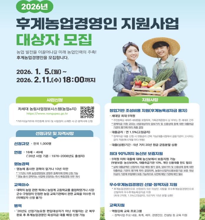 ³óÃÌ °í·Éȸ¦ ÇØ¼ÒÇϰí, ¹Ì·¡ ³ó¾÷Àη À°¼ºÀ» À§ÇÑ À̹ø »ç¾÷Àº Á¦Áֽÿ¡ °ÅÁÖÇÏ´Â 18~49¼¼(1976~2008³â Ãâ»ýÀÚ)ÀÇ ¿µ³ó°æ·ÂÀÌ ¾ø°Å³ª 10³â ¹Ì¸¸ ³ó¾÷ÀÎÀ» ´ë»óÀ¸·Î ÇÑ´Ù. ´ëÇÐ ³ó¾÷ °ü·Ã Çаú ¶Ç´Â ³ó¾÷°è °íµîÇб³ Á¹¾÷ÀÚÀ̰ųª ½ÃÀ塤±º¼ö¡¤±¸Ã»ÀåÀÌ ÀÎÁ¤ÇÑ ³ó¾÷ ±³À°±â°ü¿¡¼ °ü·Ã ±³À°À» À̼öÇÑ ½ÇÀûÀÌ ÀÖ¾î¾ß ÇÑ´Ù.