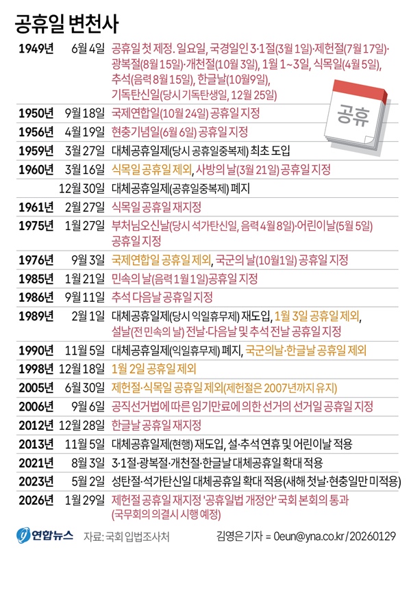 ÀÌ ¹ý¾ÈÀÌ ±¹¹«È¸ÀÇ ÀǰáÀ» °ÅÃÄ ½ÃÇàµÇ¸é 3¡¤1Àý(3¿ù 1ÀÏ), Á¦ÇåÀý(7¿ù 17ÀÏ),±¤º¹Àý(8¿ù 15ÀÏ), °³ÃµÀý(10¿ù 3ÀÏ), Çѱ۳¯(10¿ù 9ÀÏ) µî 5´ë ±¹°æÀÏ ¸ðµÎ ´Ù½Ã °øÈÞÀÏÀÌ µÈ´Ù.