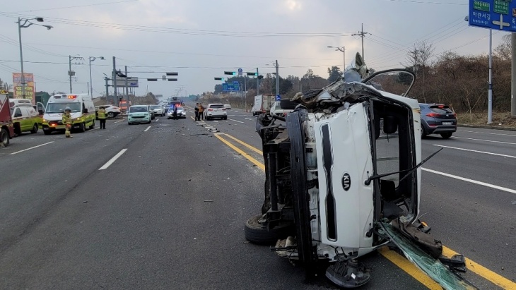 1ÀÏ Á¦ÁÖ¼Ò¹æ¾ÈÀüº»ºÎ¿¡ µû¸£¸é À̳¯ ¿ÀÀü 9½Ã42ºÐÂë ¿Àµîµ¿ ¾ÖÁ¶·Î¿¡¼ 1t ȹ°Â÷¿Í SUV Â÷·® 2´ë, °æÂ÷ 1´ë°¡ ÀÕµû¶ó Ãßµ¹Çß´Ù. ÀÌ »ç°í·Î 60´ë ȹ°Â÷ ¿îÀüÀÚ¿Í 30´ë ½ÂÇÕÂ÷ ¿îÀüÀÚ µî 2¸íÀÌ °æ»óÀ» ÀÔ¾î º´¿ø¿¡ À̼۵ƴÙ.