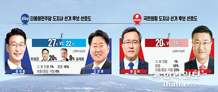Á¦ÁÖÁö»ç Èĺ¸ ¼±È£µµ Á¶»ç °á°ú ´õºÒ¾î¹ÎÁÖ´ç(ÀÌÇÏ ¹ÎÁÖ´ç) ¹®´ë¸² ±¹È¸ÀÇ¿ø 23%, °°Àº´ç ¼Ò¼Ó ¿À¿µÈÆ Á¦ÁÖÁö»ç 20%·Î ¾ç ÃøÀÌ ¿ÀÂ÷¹üÀ§(¡¾3.1%) ¾È¿¡¼ °æÇÕÇß´Ù. À̾î À§¼º°ï ¹ÎÁÖ´ç ÀÇ¿øÀÌ 16%ÀÇ ÁöÁöÀ²·Î ¹Ù¦ Ãß°ÝÇϰí ÀÖ¾ú°í, ±è½Â¿í ±¹¹ÎÀÇÈû Á¦Áֽà À» ´çÇùÀ§¿øÀåÀº 5%, ¼ÛÀçÈ£ ¹ÎÁÖ´ç Àü ±¹È¸ÀÇ¿øÀº 4%, ±¹¹ÎÀÇÈû ¼Ò¼Ó ¹®¼ºÀ¯ Àü ±âȹÀçÁ¤ºÎ Á¶Á¤½ÇÀåÀº 3%ÀÇ ÁöÁö¸¦ °¢°¢ ¾ò¾ú´Ù. ¶Ç ±è¸íÈ£ Áøº¸´ç Á¦ÁÖµµ´çÀ§¿øÀå°ú ¾çÀ±³ç ¼Ò³ª¹«´ç Á¦ÁÖµµ´çÀ§¿øÀåÀº °¢°¢ 1%ÀÇ ÁöÁöÀ²À» ±â·ÏÇß´Ù. ¼±È£ÇÏ´Â Àι°ÀÌ ¾ø°Å³ª, Àß ¸ð¸£°Ú´Ù ¶Ç´Â ÀÀ´äÀ» °ÅÀýÇÑ ºÎµ¿ÃþÀº 26%´Ù.
