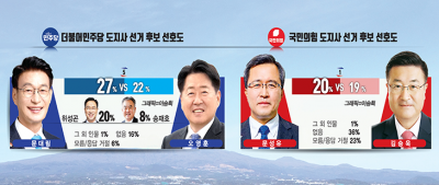 'µµÁö»ç ¼±°Å Ã⸶°¡ °Å·ÐµÇ´Â Àι° Áß ´©°¡ ¹ÎÁÖ´ç È帷Π³ª¼´Â °ÍÀÌ °¡Àå ÁÁ´Ù°í »ý°¢ÇÏ´ÂÁö'¸¦ ¹°Àº °á°ú ¹®´ë¸² 27%, ¿À¿µÈÆ 22%·Î ¾çÃøÀÌ ¿ÀÂ÷¹üÀ§ ¾È¿¡¼ Á¢ÀüÀ» ÆîÃÆ´Ù. ¶Ç À§¼º°ï ÀÇ¿øÀÌ 20%ÀÇ ÁöÁöÀ²À» ±â·ÏÇÏ¸ç ¹® ÀÇ¿ø°úÀÇ °ÝÂ÷°¡ ¿ÀÂ÷¹üÀ§(¡¾3.1%) ¹ÛÀ̱ä ÇÏÁö¸¸, ±× Â÷À̰¡ ¹Ì¹ÌÇÏ°í ¿À Áö»ç¿Í´Â ¿ÀÂ÷¹üÀ§ ¾È¿¡¼ ´ÙÅõ°í ÀÖ¾î ÆÇ¼¼¸¦ ¿¹ÃøÇϱâ Èûµç »óȲÀÌ´Ù. ÁöÁöÇÏ´Â Àι°ÀÌ ¾ø°Å³ª ÀÀ´äÀ» °ÅÀýÇÑ ºÎµ¿ÃþÀº 22%´Ù.