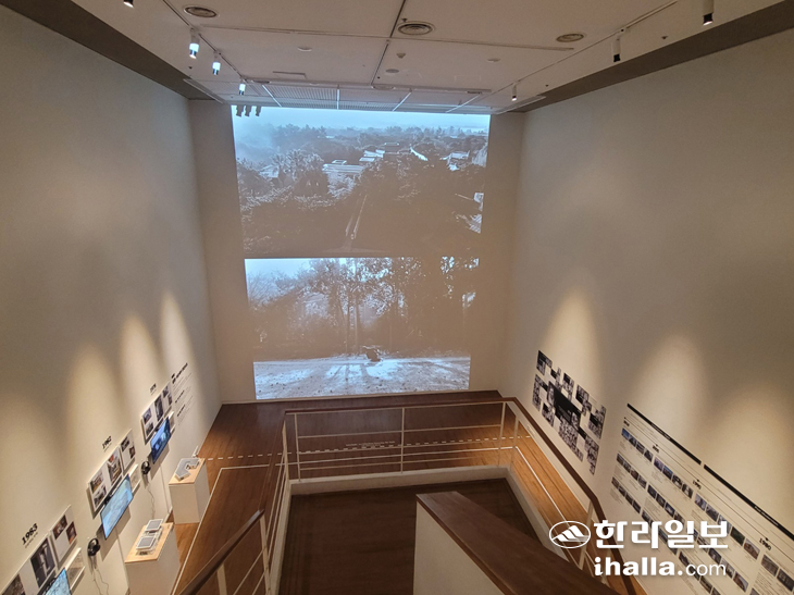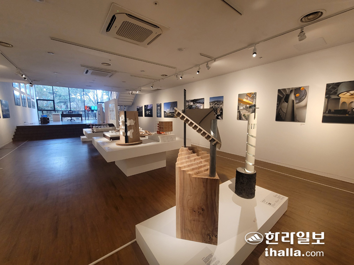 ´ÙÀ½ Àü½Ã½Ç·Î À̵¿Çϸé '½Ã´ë, °ÇÃà°úÀÇ ¸¸³²'À» ¸¶ÁÖÇÑ´Ù. Á¦ÁÖ¿¡¼ Ȱµ¿ÇÏ´Â ¹«¿ë°¡, ¿µ»ó°¨µ¶, °ÇÃà°¡°¡ Çù¾÷ÇØ °ÇÃà ¼Ó¿¡¼ ÆîÃÄÁö´Â ¿òÁ÷ÀÓ°ú ¸®µëÀ» ÅëÇØ 'Á¦ÁÖü'¸¦ °¨°¢ÀûÀ¸·Î ÆîÃij½ ¿µ»óÀÌ ½Ã¼±À» ²ö´Ù. ¿µ»óÀ» ¹Ù¶óº¸¸ç °è´ÜÀ» µû¶ó ³»·Á¿À¸é ±×¿Í µ¿½Ã´ë¿¡ ±³·ùÇß´ø °ÇÃà°¡µéÀÇ °ü°è¸¦ »çÁøÀ¸·Î ¼Ò°³ÇÑ´Ù. À̾î '½Çõ, »çÀ¯¿¡¼ °ø°£À¸·Î'¶ó´Â ÁÖÁ¦ÀÇ Àü½Ã°ø°£¿¡¼´Â Á¦ÁÖ¿¡¼ Ȱµ¿À» ½ÃÀÛÇÑ 1970³â´ë ÈĹݺÎÅÍ ½Ã±âº° ´ëÇ¥ÀûÀÎ ÁÖ°Å¿Í °ø°ø ÇÁ·ÎÁ§Æ®°¡ ÆîÃÄÁö¸ç Á¦ÁÖ °ÇÃàÀÇ È帧À» º¸¿©ÁØ´Ù.