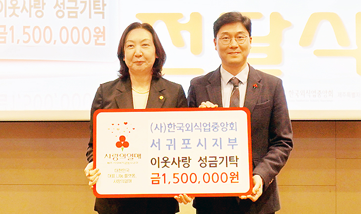 [ÇѶóÀϺ¸] (»ç)Çѱ¹¿Ü½Ä¾÷Áß¾Óȸ¼±ÍÆ÷½ÃÁöºÎ(ÁöºÎÀå À̺п©)´Â Áö³ 9ÀÏ ÆÄÅ©¼±»þÀÎ Á¦ÁÖ È£ÅÚ¿¡¼ ¿¸° Á¤±âÃÑȸ¿¡¼ ¼º±Ý 150¸¸¿øÀ» Á¦ÁÖ»çȸº¹Áö°øµ¿¸ð±Ýȸ(ȸÀå °Áö¾ð)¿¡ ±âŹÇß´Ù. À̹ø ¼º±ÝÀº ¼±ÍÆ÷½Ã ´ë·ûµ¿ ³» ¾î·Á¿î ÀÌ¿ôµéÀ» À§ÇÑ Áö¿ø»ç¾÷¿¡ »ç¿ëµÉ ¿¹Á¤ÀÌ´Ù.