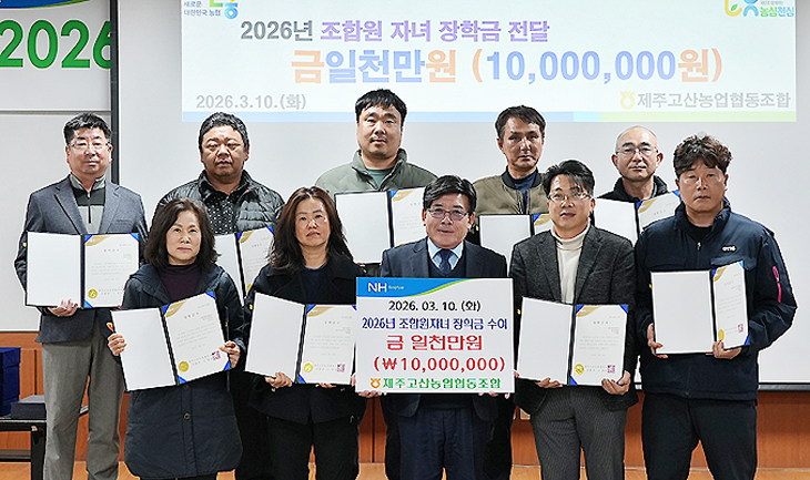Á¦ÁÖ°í»ê³óÇù(Á¶ÇÕÀå °í¿µÂù)Àº Áö³ 10ÀÏ ³óÇù À¯Åë¼¾ÅÍ¿¡¼ Á¶ÇÕ¿ø ÀÚ³à 14¸í¿¡ ÃÑ 1000¸¸¿øÀÇ ÀåÇбÝÀ» Àü´ÞÇß´Ù.