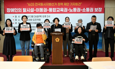 Á¦ÁÖÆ¯º°ÀÚÄ¡µµ Àå¾ÖÀÎÂ÷º°Ã¶Æó¿¬´ë ÁغñÀ§¿øÈ¸(ÀÌÇÏ Á¦ÁÖÀüÀ忬(ÁØ))´Â 26ÀÏ ¿ÀÈÄ Á¦ÁÖµµÀÇȸ µµ¹ÎÄ«Æä¿¡¼ ¡®6¡¤3 Àü±¹µ¿½ÃÁö¹æ¼±°Å Á¤Ã¥ Á¦¾È ±âÀÚȸ°ß¡¯À» ¿¾ú´Ù.